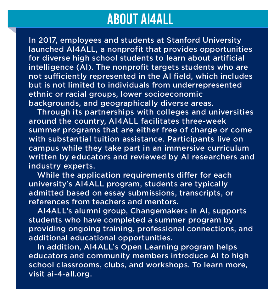 A critical component of the AI4ALL summer program is its lower requirements for entry, which is essential for ensuring diverse students can participate. Unlike many computer science degree programs, for instance, AI4ALL does not require attendees to already know coding.